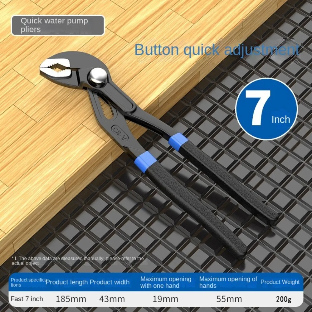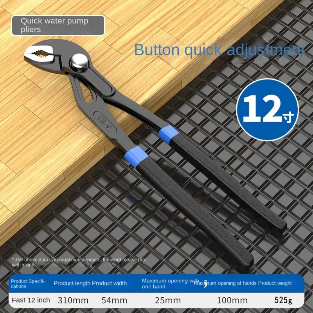 These universal water pump pliers are designed for quick and efficient gripping, turning, and tightening of pipes and fittings. Available in 7, 10, and 12-inch sizes, they accommodate a wide range of plumbing and household tasks. The adjustable jaws allow for secure gripping on pipes of various diameters, while the quick-release mechanism ensures fast and easy size adjustments. Featuring an ergonomic comfort grip, the pliers reduce hand fatigue during prolonged use and provide better control. The durable steel construction delivers long-lasting strength and resists wear even under heavy use. Ideal for plumbers, mechanics, and DIY enthusiasts, they are suitable for both professional and home applications. Their large opening design makes it easy to handle bigger pipes and fittings with minimal effort. Compact and versatile, these pliers are a reliable tool for tightening, loosening, or holding plumbing components securely. Perfect for water, gas, and automotive repair tasks, they combine precision, strength, and convenience. Whether for professional plumbing or occasional household repairs, this set of water pump pliers offers efficiency and durability in one tool.